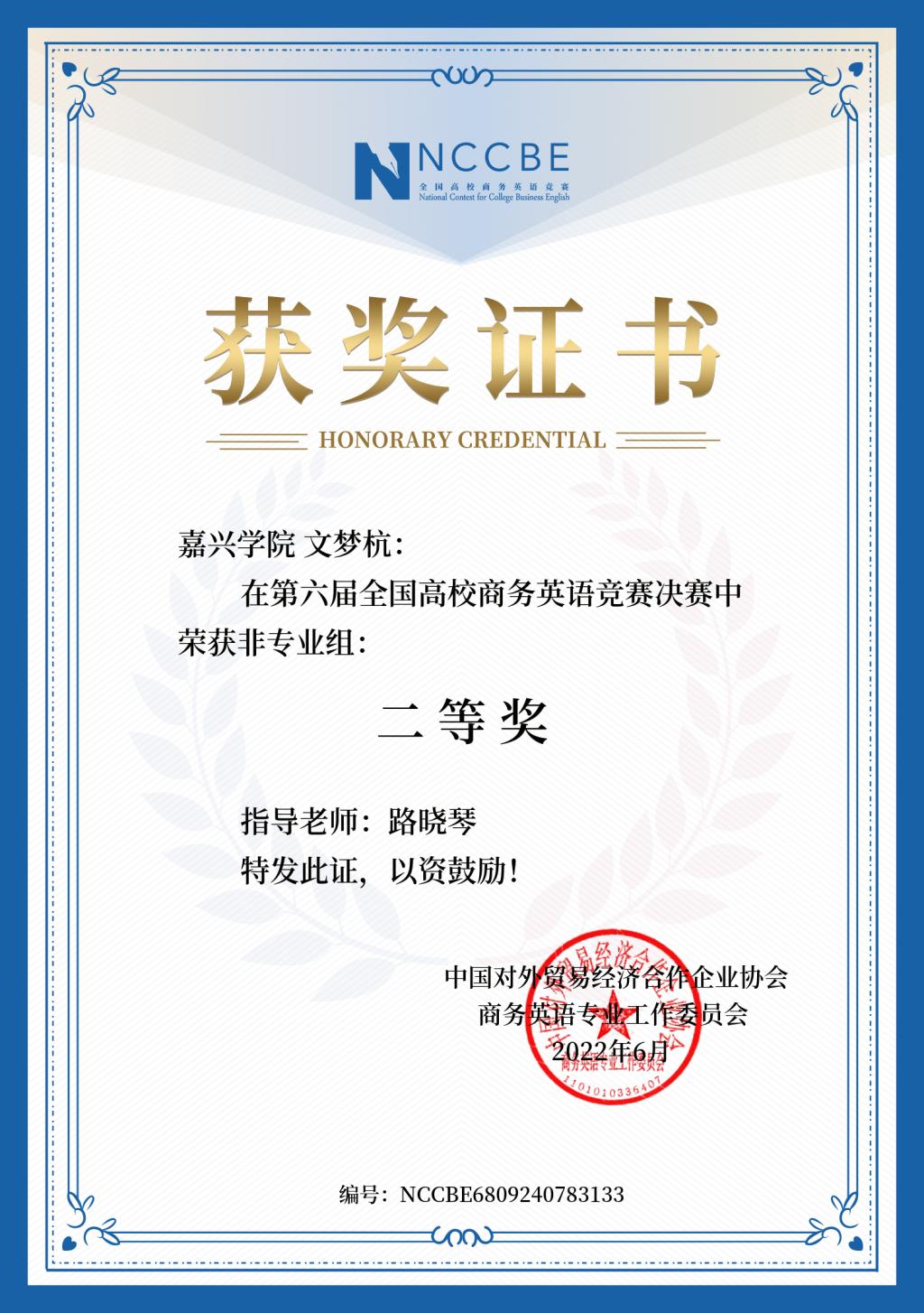 据了解,学院从今年2月份就开始竞赛的准备工作。从学院立项学科竞赛项目到赛点学校的申请再到后面发动组织学生参赛,学院领导、商务英语课程组和学院老师们都给予了热情鼓励和大力协助。具体负责竞赛组织和指导的大外部杨桂华和路晓琴两位老师为大赛投入了大量的时间和精力。她们鼓励学生树立信心、积极参赛,为同学们收集竞赛练习题、答疑解惑。在她们的共同努力下,同学们踊跃报名、刻苦备赛,在此项竞赛中分别获得一等奖和二等奖的好成绩。本次大赛的成功举办为培养学生商务英语素养,展示我校学生风采搭建了一个国家级竞赛平台,所取得的优异成绩增强了同学们的自信心,充分展现了我校学生的知识水平与精神风貌。