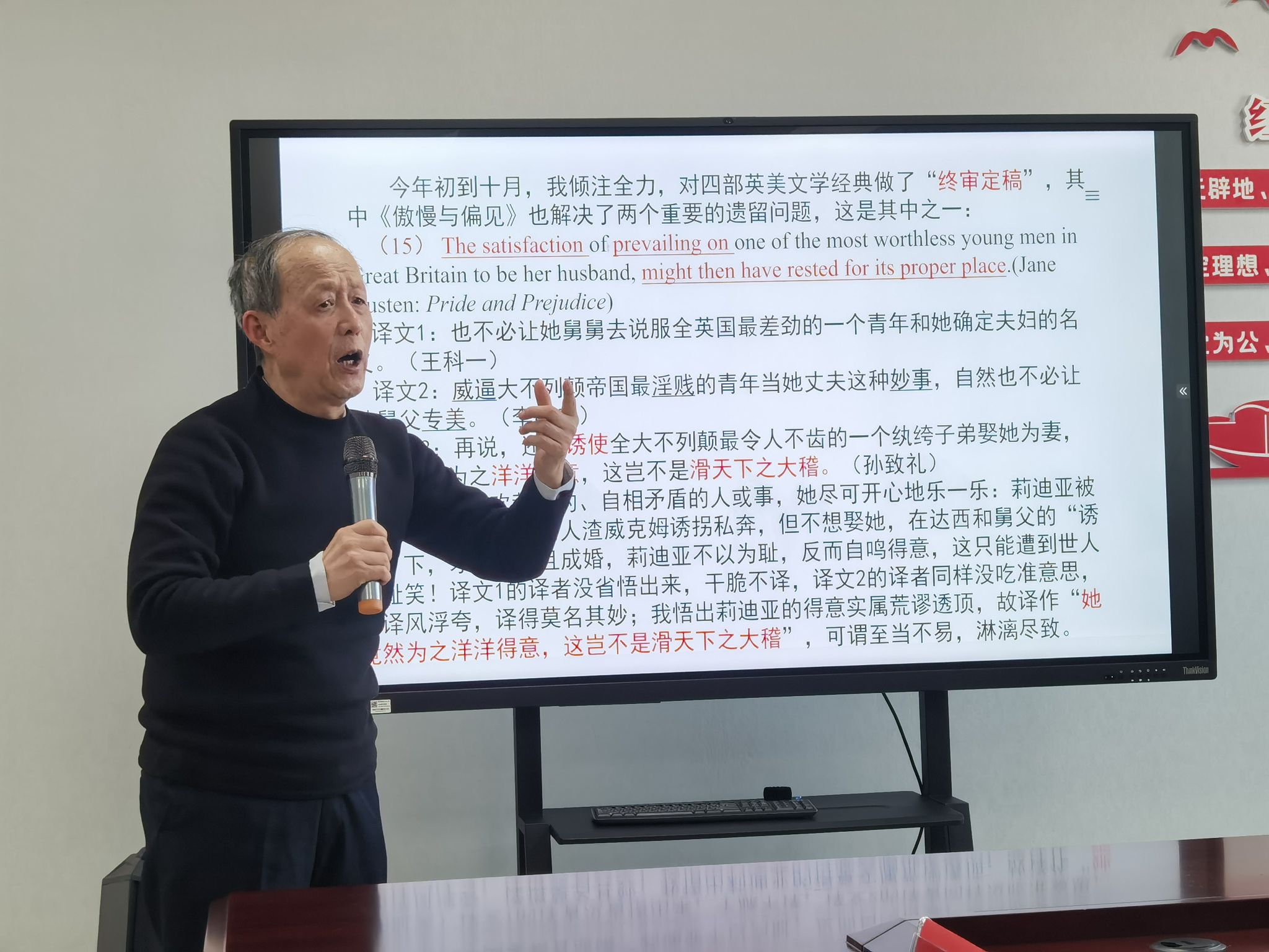 11月21日下午,我国著名翻译家及翻译理论家、中国翻译协会“翻译文化终身成就奖”获得者孙致礼教授应邀为小黄书 师生作题为“我的英美文学翻译之道”的学术讲座。孙致礼教授是原解放军小黄书 英语语言文学专业学术带头人、博士生导师,代表性译著《傲慢与偏见》《瓦尔登湖》《老人与海》等脍炙人口、长销不衰。本次讲座由院长唐艳芳主持,学院教师代表及翻译专业硕士研究生三十余人参加。