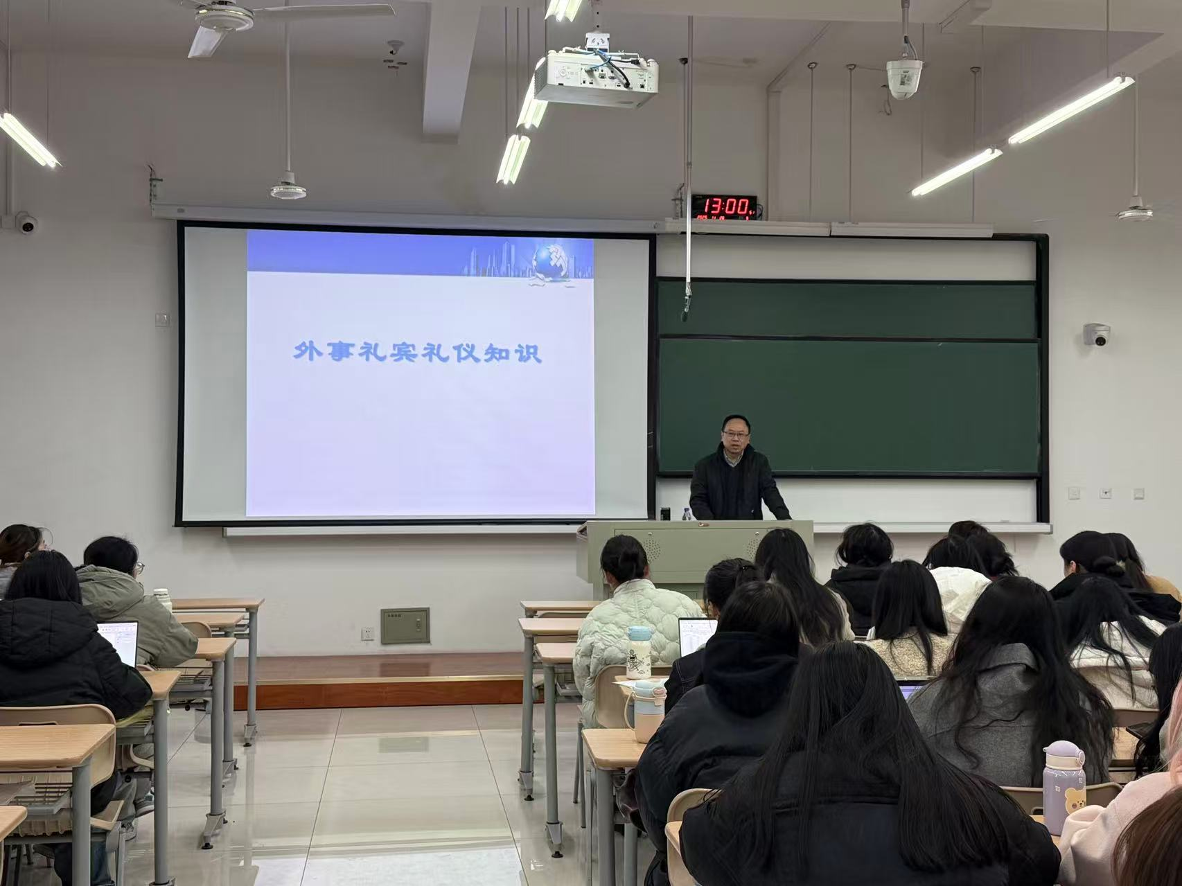 2025年11月28日,浙江省人民政府外事办公室经济与新闻处张汶处长应邀莅临嘉兴大学小黄书 ,为高年级本科生、翻译专业硕士研究生及教师代表五十余人,作题为“外事礼宾礼仪知识”的专题讲座。