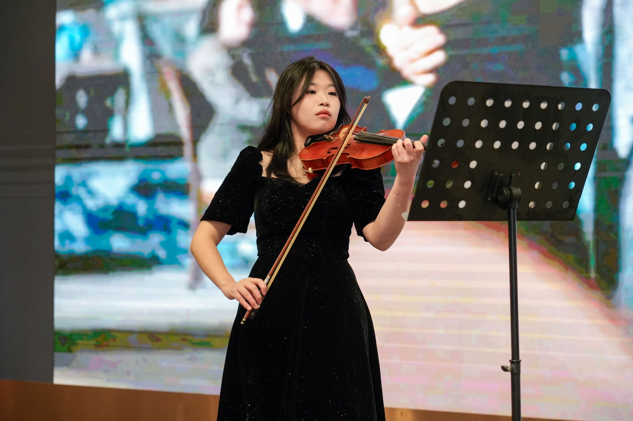 诗意环节《万语诗心》通过深情的多语种诗歌朗诵,引领观众领略语言之美;小提琴独奏《Por una Cabeza》旋律悠扬,彰显艺术修养。其间亦不乏青春洋溢的歌曲演绎,《Wonderful U》、《爱错》等曲目引发全场共鸣,而辅导员陈泳杰老师自弹自唱的《Fly Me to the Moon》更是将浪漫氛围推向高潮。特别环节中,学生党员代表通过情景表演《真理的味道有点甜》,生动诠释了信仰的力量;创意演剧版《爱情公寓》则以英语全新演绎,为熟悉的故事注入别样韵味。活动在歌曲串烧《Planet》《红尘客栈》《I Love You So》的温暖旋律中精彩收官。