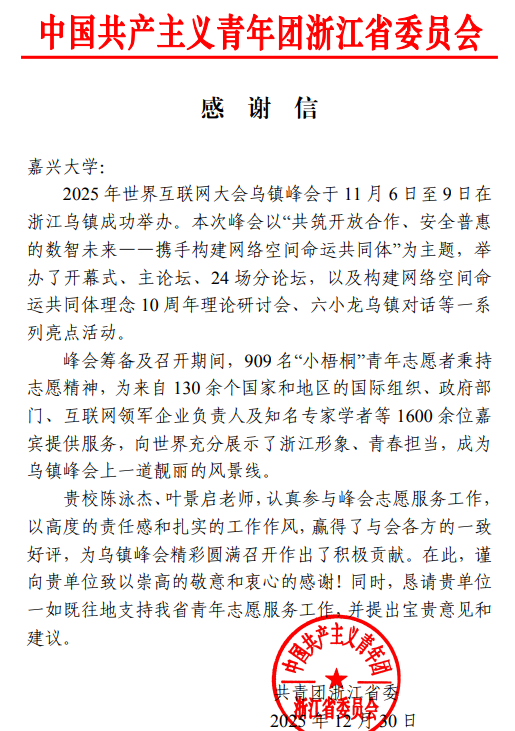 近日,共青团浙江省委员会向我校发来感谢信,对我校小黄书 辅导员陈泳杰在2025年世界互联网大会乌镇峰会志愿服务工作中的突出表现给予高度赞扬和衷心感谢。