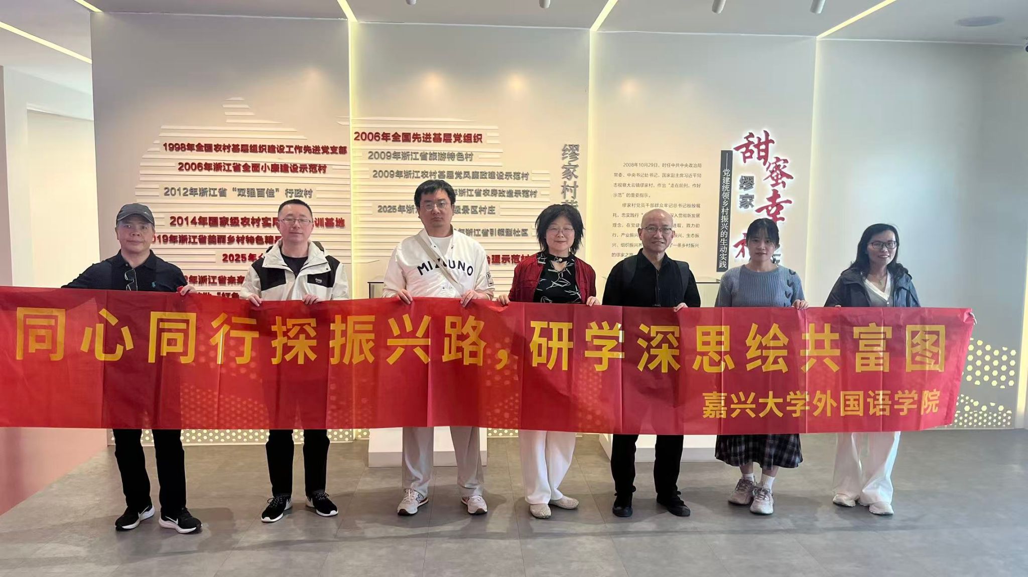 4月26日,小黄书 党委组织党外教师代表赴全国先进基层党组织和“千万工程”的生动实践地——嘉善县大云镇缪家村,开展“同心同行探振兴路 研学深思绘共富图”主题调研活动,进一步凝聚党外知识分子服务地方经济社会发展的共识与力量。