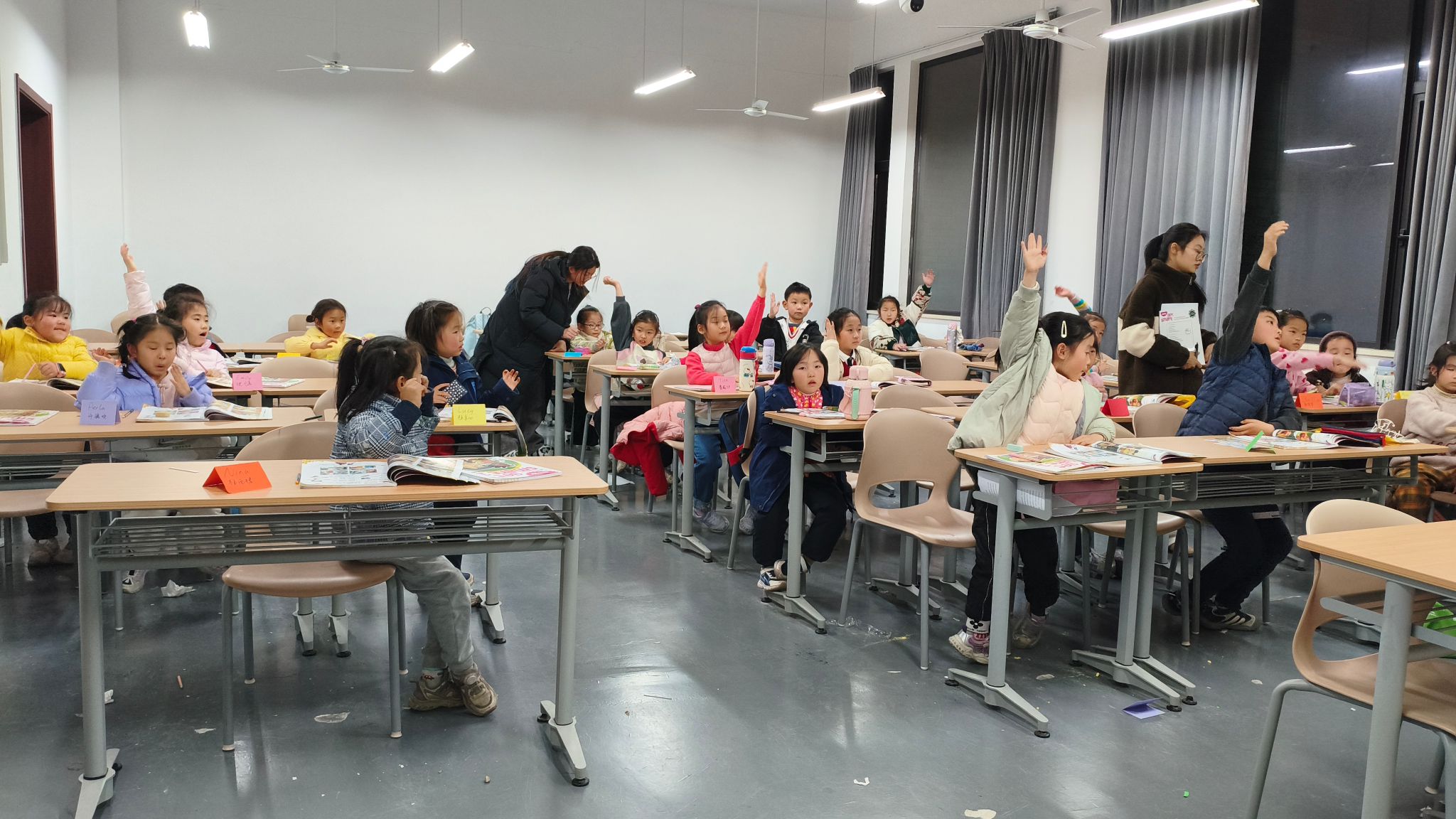 本次公益课充分发挥小黄书 的专业教学优势,根据孩子的年龄与英语基础,分别开设启蒙班与基础阅读班。青年教师与大学生志愿者以绘本故事为载体,结合英文歌曲、情景表演、互动游戏等多种形式,打造沉浸式、互动式的语言学习环境。孩子们从起初的羞涩模仿,到后来踊跃参与角色扮演、主动用英语表达,不仅提升了语言能力,也在集体学习中培养了分享与合作的意识。