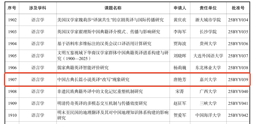 近日,2025年度国家社科基金项目立项名单正式公布。我院唐艳芳教授作为项目负责人申报的《中国古典长篇小说英译“改写”现象研究》成功获批立项。这是唐艳芳教授主持获立的第二个国家社科基金项目,也是我院继单谊教授在语用学国际顶刊Journal of Pragmatics发表学术论文之后,教师在学术研究方面取得的又一重要突破,彰显了学院在语言学与翻译研究领域的学术实力,是学院近年来不断深化有组织科研的重要成果。