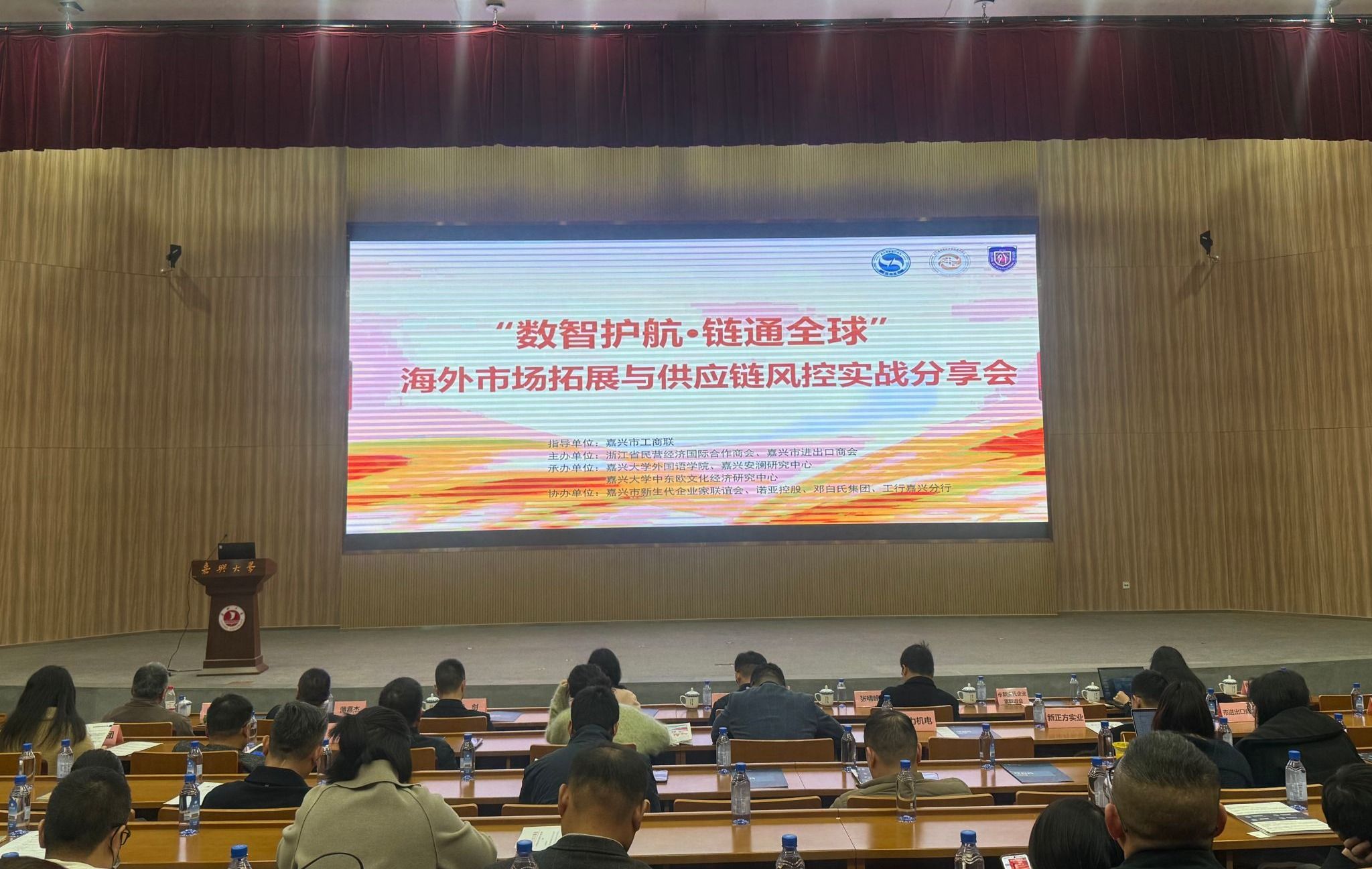 为助力外贸企业出海破局,智慧化解贸易风险,高效融入全球供应链体系,12月11日,“数智护航·链通全球”——海外市场拓展与供应链风控实战分享会在我校顺利举办。本次活动在嘉兴市工商联的指导下,由嘉兴市进出口商会联合浙江省民营经济国际合作商会共同主办,嘉兴大学小黄书 、嘉兴安澜研究中心、嘉兴大学中东欧文化经济研究中心承办,嘉兴市新生代企业家联谊会、诺亚控股、邓白氏、工商银行协办,吸引了70余位外贸企业代表参加,共探出海发展新路径。