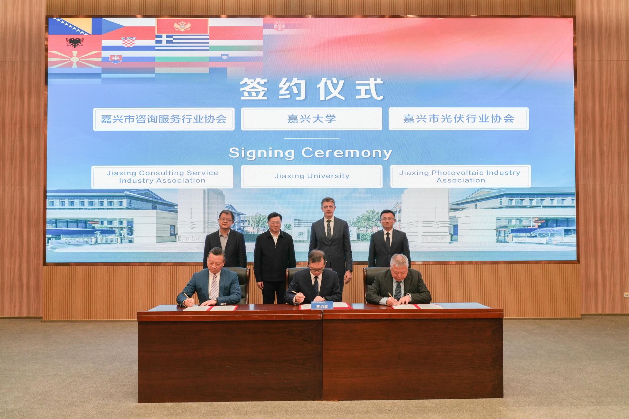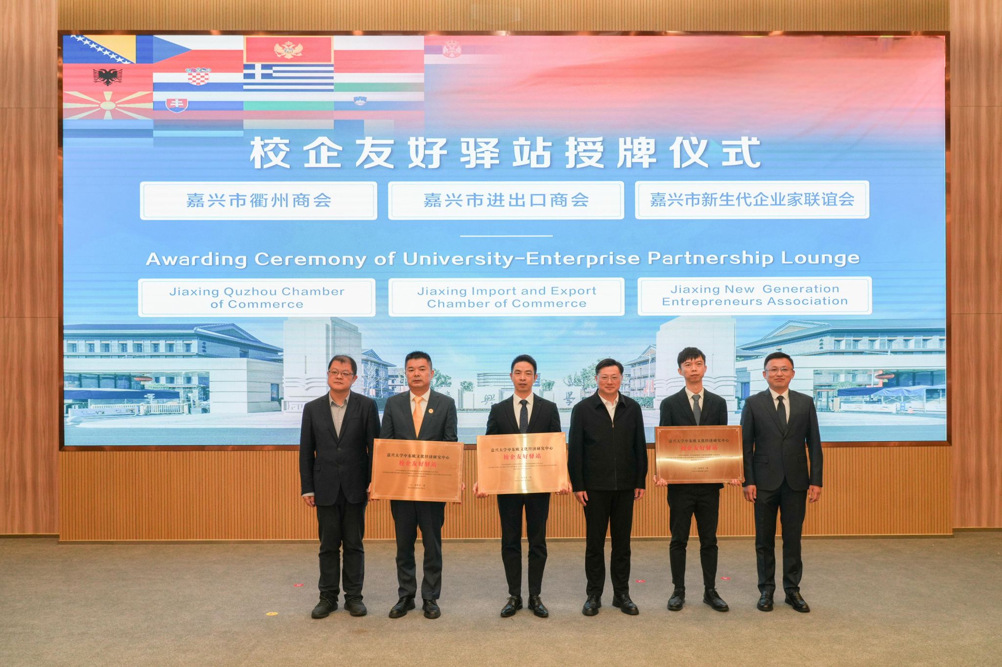 会上,还进行了校企合作签约与友好驿站授牌。嘉兴大学中东欧文化经济研究中心分别与嘉兴市咨询服务行业协会、嘉兴市光伏行业协会签署合作协议,依托高校智库资源与行业协会渠道优势,打通政策解读、供应链对接等服务壁垒;与嘉兴市进出口商会、嘉兴市新生代企业家联谊会和嘉兴市衢州商会进行校企友好驿站授牌,搭建起实体沟通窗口,未来将定期互通市场动态与产业需求,实现“产学研用”闭环联动,助力企业快速融入中东欧产业链体系。
